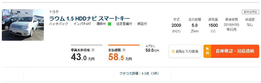平成21年式走行距離6万キロのラウムをカーセンサーネットで検索してみました。結果、諸費用込みの金額で下記例のように50~60万のものが多く掲載されています。(支払総額58.5万円)