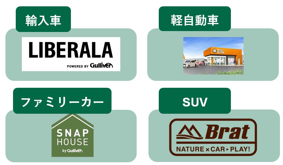 輸入車(LIBERALA)、軽自動車(ガリバーミニクル)、ファミリー向け(SNAP HOUSE)、SUV(Brat)といったカテゴリ別の専門店ネットワークを活用し、各顧客セグメントに合った在庫確保と販売を実現しています。これにより、輸入車やハイグレード車も適切に評価・販売できる体制が整っています。